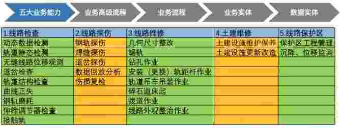 在轨道运维业务中,,,,我们形成了完整的从业务能力(业务域)-业务流程-业务实体-数据模型的分析梳理过程。。轨道运维业务能力如下图所示:::